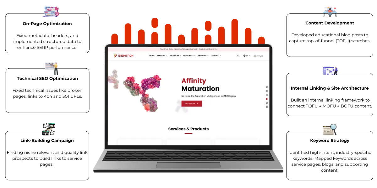 The website was underperforming because it was not aligned with how researchers and biotech companies search online. Without SEO optimization, Biointron’s high-value service pages were invisible in search results, limiting lead generation and conversions.
